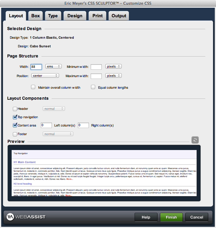 - Output: Define the the destinations for screen and print CSS styles (embedded or in an external style sheet), the degree of placeholder content and comments, and the creation or overwriting of a layout preset to store your layout configuration for future use.